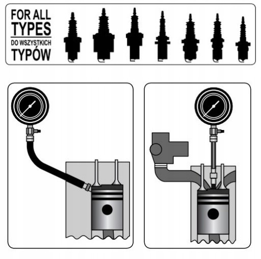 Testerem można dokonać pomiaru ciśnienia sprężania w samochodach i motocyklach z silnikiem benzynowym. Tester jest uniwersalny i pasuje do wszystkich gniazd świecowych.