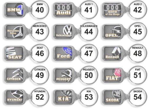 Graficzne logo na przedniej stronie breloczka wykonane technologią domingu. Nadruk grafiki wykonany na srebrnej folii metalizowanej [2], zalanej specjalnym polimerem o dużej przejrzystości i dużej odporności na zarysowania, matowienie, promienie słoneczne (UV) [1]. Całość wklejona na przedniej stronie breloczka [3].