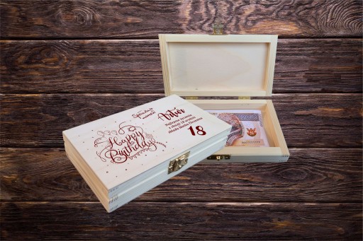 Chcesz elegancko wręczyć prezent w postaci gotówki? Mamy dla Ciebie rozwiązanie - pudełko na pieniądze na 18 urodziny lub inna okazja. Grawerowane pudełko jest idealnym prezentem. Prezent 2 w jednym: etui na banknoty i pudełko, które będzie pamiątką może służyć jako pudełko na drobiazgi.