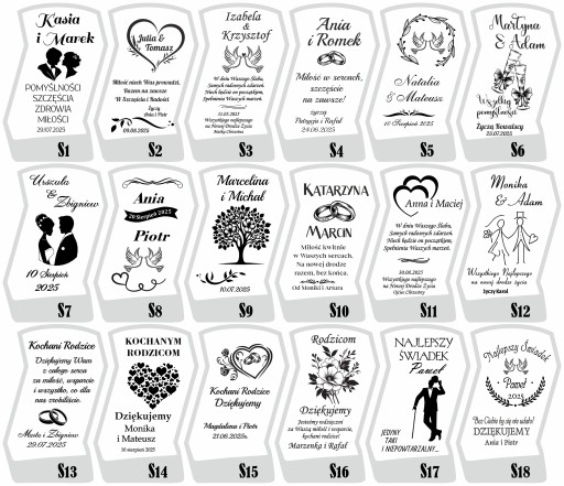 Przedmiotem aukcji jest zestaw składający się z karafki łamanej oraz dwanaście kieliszków z grawerem, zapakowane w białe pudełko z przegródkami w środku. Dodatkiem jest kolorowa rafia ozdobna. Może to być wyjątkowy prezent na dowolną uroczystość: np. wieczór kawalerski, panieński, ślub lub podziękowanie rodzicom, urodziny, rocznicę. Możliwość indywidualnego graweru sprawi, że taki prezent będzie wyjątkowy. Dla wygody naszych klientów przygotowaliśmy szeroki wybór wzorów, które znajdują się poniżej. Mogą Państwo również liczyć na pomoc w przygotowaniu projektu.