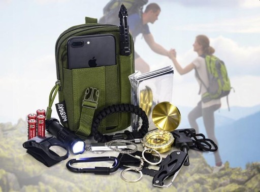 Saszetka wypełniona gadżetami survivalowymi niezbędnymi do przetrwania w dziczy!