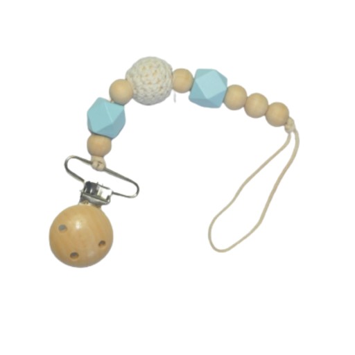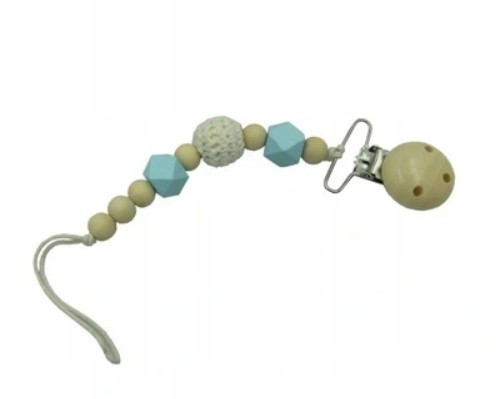 Klips do smoczka uspokajającego z uniwersalnym zapięciem na tzw. „klamerkę”. Produkt wykonany z drewna. Nada się jako upominek/prezent dla świeżo upieczonej mamy z bobasem. Model niebieski / blue.