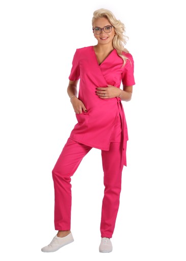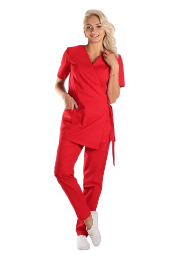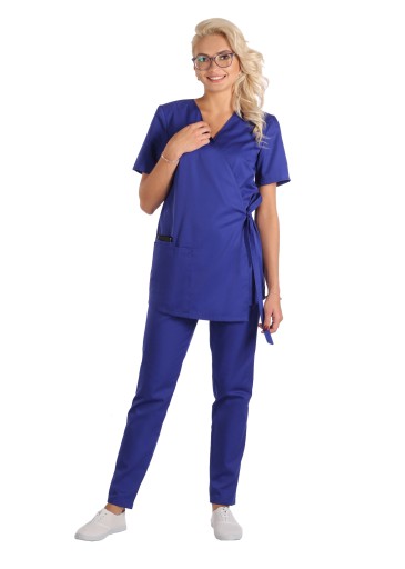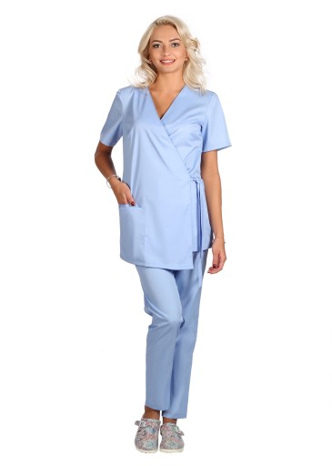 Bluza medyczna,kosmetyczna ,fason kimono. Wiązane z obu stron boki bluzy, pozwalają na dowolne dopasowanie do sylwetki ( stąd rozmiary łączone) . Lekko skośny jeden z przodów, ładnie wydłuża sylwetkę . To bluza nieco dłuższa niż klasyczne bluzy medyczne . Krótki rękaw, podwójna kieszeń na wysokości prawego biodra (mniejsza mieści smartfon) .