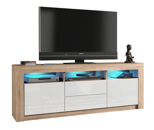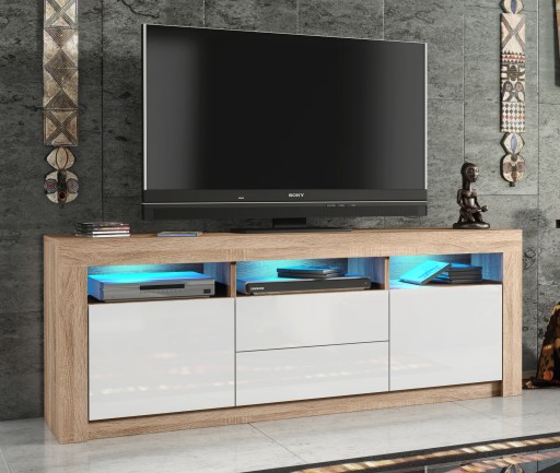 Szafka RTV pod maksymalnie 70-calowy telewizor. Front szafki – szuflady i drzwiczki – wykonane są z płyty MDF wykończonej na wysoki połysk. Szafka składa się z trzech otwartych komór, z których każda dodatkowo może zostać podświetlona diodą LED (oświetlenie nie znajduje się w zestawie). Komory przeznaczone są na sprzęt audio lub wideo. Poniżej nich znaleźć można cztery pojemne przestrzenie, dwie skrajne zamykane drzwiczkami oraz dwie szuflady. Drzwi jak i szuflady nie posiadają wystających uchwytów, są bowiem otwierane z wykorzystaniem systemu push to open. Osobom lubiącym porządek nasza szafka zapewnia mnóstwo miejsca na rzeczy, których nie chcemy trzymać na widoku. Pojemne szuflady pomieszczą drobny osprzęt tj. piloty, dodatkowe kable i przejściówki, których nie wykorzystujemy na co dzień. Obszerne skrajne półki to z kolei doskonałe miejsce na książki, płyty CD, płyty winylowe czy kolekcję ulubionych filmów. Korpus szafki wykonany jest z płyty laminowanej o grubości 16 mm.