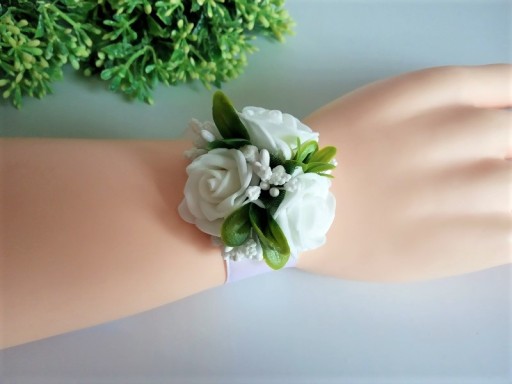 Na rękę wiązany jest za pomocą satynowej tasiemki o szerokości 25mm i długości ok. 40cm.