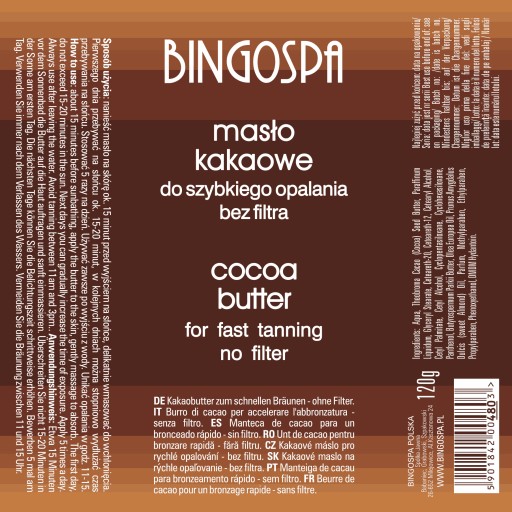 Masło kakaowe BINGOSPA zawiera wiele cennych dla skóry substancji, witamin i antyutleniaczy - sprawia, że skóra jest intensywnie odżywiona, nawilżona i zrelaksowana. Naturalne antyoksydanty chronią skórę przed działaniem wolnych rodników. Masło kakaowe jest biozgodne ze skórą, co oznacza, że jest w pełni tolerowane przez skórę i nie powoduje uczuleń. Jego delikatna konsystencja pieści skórę, nasycając ją odżywczymi składnikami. Równomiernie rozprowadza się na skórze sprzyjając powstaniu doskonałej i trwałej opalenizny.