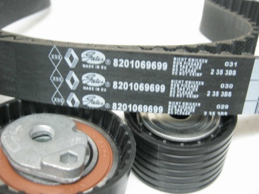 Przedmiotem aukcji jest Nowy Oryginalny zestaw rozrządu stosowany przy silnikach 1.4 16V oraz 1.6 16V, oznaczenie silników K4J, K4M wraz z oryginalną pompą wody (metalowy wirnik) oraz zaślepi wałków rozrządu (mała i duża).