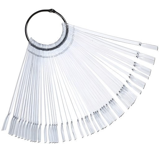 Praktyczny wzornik lakierów z 50 transparentnymi tipsami. Próbnik w formie wachlarza na metalowym kółku. Będzie bardzo pomocny podczas wybierania koloru lakieru lub wzorku na paznokcie. To bardzo czytelna, wygodna oraz estetyczna paleta do malowania lakierami klasycznymi, hybrydowymi lub żelami. Wzornik jest poręczny, solidnie wykonany, przydatny w każdym salonie kosmetycznym.