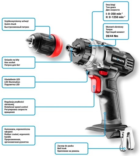 Wiertarko-wkrętarka współpracująca z akumulatorami 18V Li-Ion GRAPHITE Energy+. Elektronarzędzie posiada płynną regulację prędkości obrotowej oraz przełącznik kierunku obrotów. Samozaciskowy uchwyt pozwala na stosowanie osprzętu o średnicy 0.8 - 10 mm. Uchwyt jest zdejmowany, a pod nim znajduje się gniazdo sześciokątne 1/4”. Maksymalna prędkość obrotowa wrzeciona na pierwszym biegu wynosi 350, a na drugim 1250 obrotów na minutę. Maksymalny moment obrotowy wynosi 28 Nm (wkręcanie miękkie) / 44 Nm (twarde) i może być regulowany poprzez 19-stopniowe sprzęgło z dodatkową opcją wiercenia. Urządzenie wyposażono w elektryczny hamulec silnika i automatyczną blokadę wrzeciona. Uruchamiana automatycznie dioda LED podświetla miejsce pracy. Ergonomiczny kształt rękojeści i zwarta konstrukcja wiertarko-wkrętarki pozwalają na wygodną pracę także w trudnych warunkach. Rękojeść została pokryta materiałem antypoślizgowym, dzięki czemu elektronarzędzie pewnie leży w dłoni. Przekładnia planetarna została wykonana z wysokogatunkowej stali.