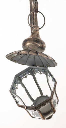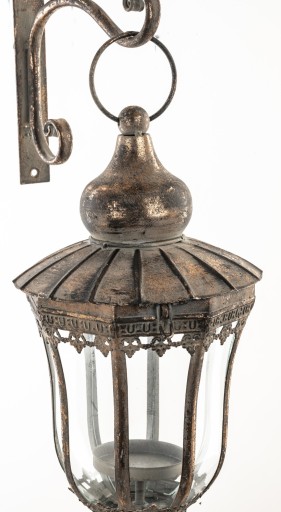 Metalowy lampion wiszący, wykonany techniką celowych postarzeń, przetarć. Wspaniale sprawdzi się jako ozdoba balkonów, tarasów, ogrodów oraz mieszkań. Lampion posiada metalową rączkę, którą zawieszamy na ścianie, na niej wieszamy lampion. Do środka możesz włożyć świeczkę, którą chroni szklany klosz.