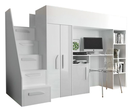 Łóżko Antresola KORI to nowoczesna i funkcjonalna propozycja do pokoju dziecięcego. Dzięki swojej konstrukcji pozwala zaoszczędzić dużo miejsca w pokoju Twojego dziecka; posiada funkcjonalne biurko z półkami a także szafkę. Stronę łóżka można wybrać w trakcie montażu.