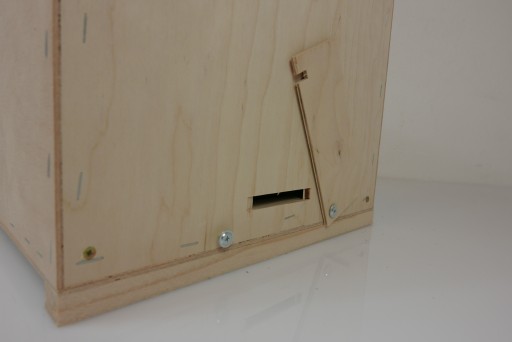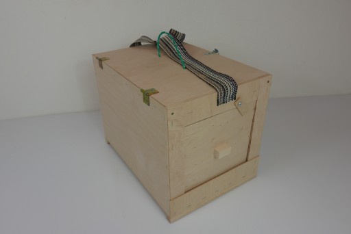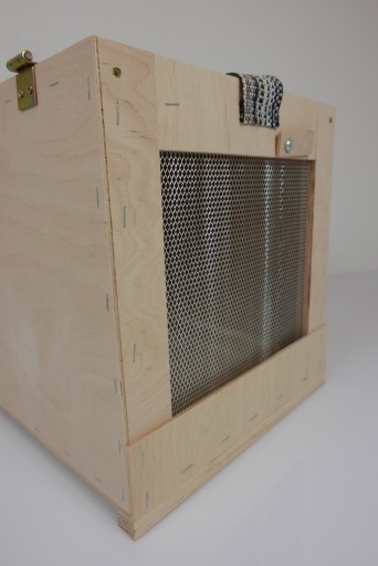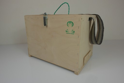 Transportówka - rojnica na ramki DADANT (7 sztuk). Jedna ścianka zrobiona z aluminiowej siatki zapewnia wentylację, ścianka przeciwległa ma wylotek, dzięki któremu transportówka może służyć jako tymczasowy ul dla roju lub odkładu. Solidna klapa zamontowana na zawiasach, zamykana na zamknięcie skrzyniowe zapewnia bezpieczeństwo pszczół podczas transportu.
