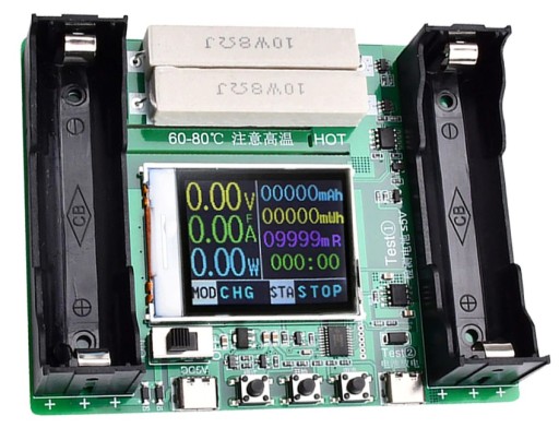 Prąd rozładowywania to 500mA przy obciążeniu 8Ω. Moduł posiada diody LED informujące o wyświetlanej jednostce, oraz uruchomionym trybie testowania.