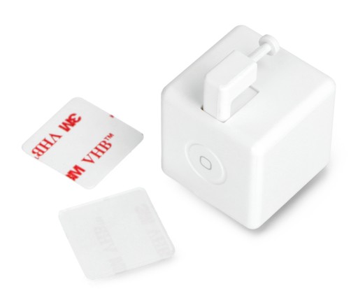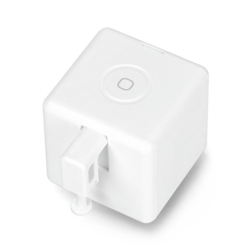Fingerbot Plus to mechanizm, który modernizuje tradycyjne przełączniki w inteligentne urządzenia sterowane z poziomu aplikacji, głosowo lub ręcznie poprzez dotyk. Niewielki moduł Fingerbot wyposażony został w ramię, które po uruchomieniu mechanizmu przyciska lub ciągnie przełącznik w celu uruchomienia danego urządzenia, np. źródła światła, ekspresu do kawy czy komputera PC. Jego niewielka konstrukcja o wymiarach 34,5 x 34,5 x 34,5 mm i montaż za pomocą dwustronnej taśmy 3M sprawiają, że może zostać on umieszczony na praktycznie każdym przedmiocie. Komunikuje się on poprzez łączność bezprzewodową Bluetooth LE 4.2. Fingerbot Plus w białej wersji kolorystycznej.