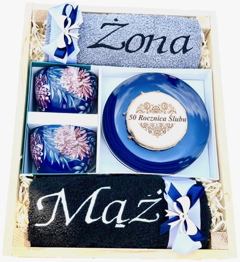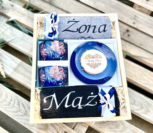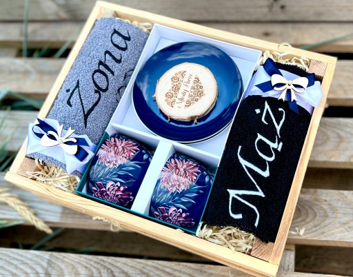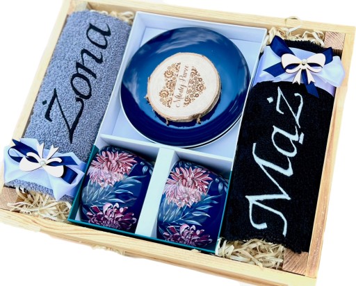 Praktyczny i oryginalny prezent na ślub. Ekskluzywny zestaw ręczników i wyjątkowych filiżanek z podstawkami.