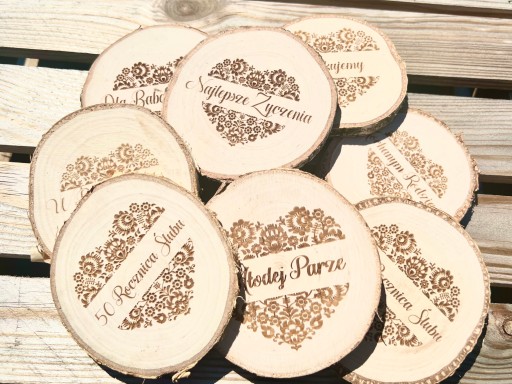 - plaster drewna z grawerem do wybór: W rocznicę ślubu, Młodej Parze,