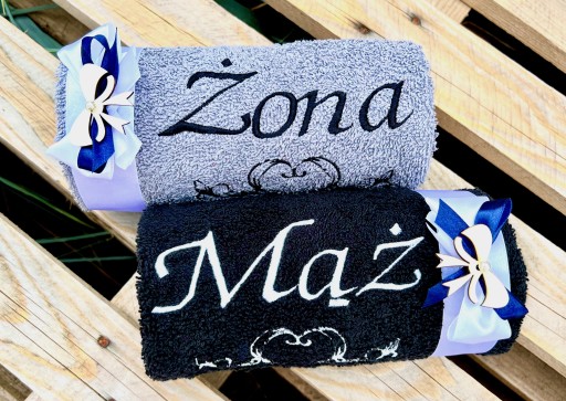 - czarny ręcznik Mąż + ozdobne wywijasy.
