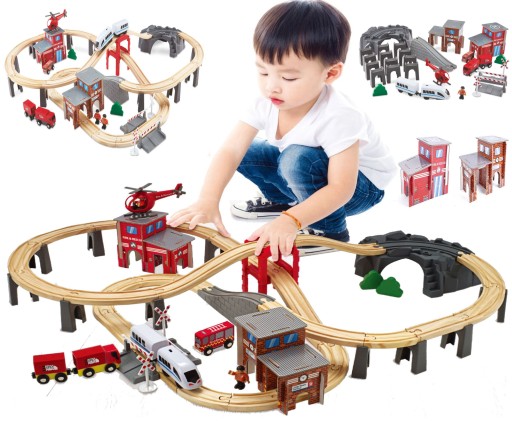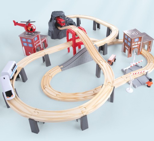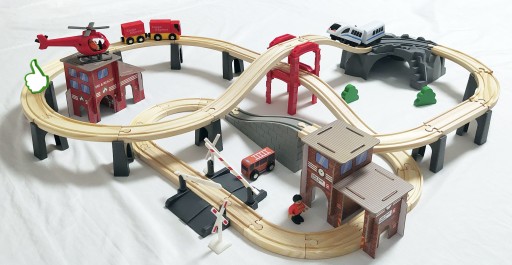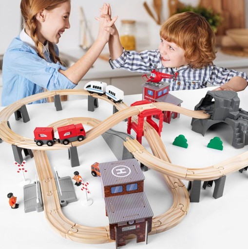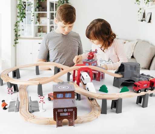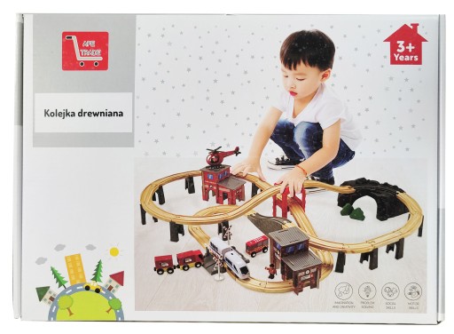 Unikalny zestaw drewnianych torów oraz pociągu, który tworzą zabawny tor, a wiadukt zwiększa atrakcyjność zestawu.