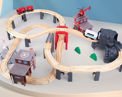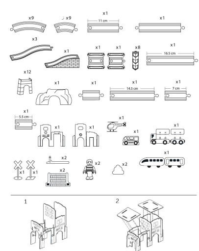 Zestaw składa się z drewnianych wznoszących torów, zjazdów, zakrzywionych i prostych elementów torów, które mogą stanowić element rozbudowy do montażu z innym zestawem torów kolejowych.