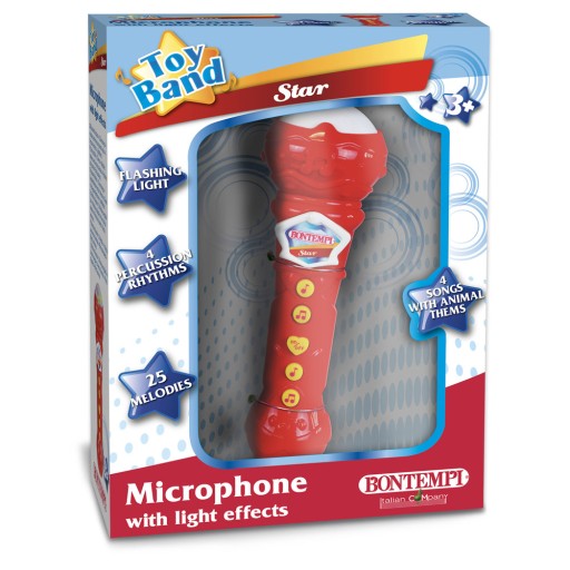 Mikrofon do karaoke, który zawiera wgranych 25 utworów demo, 4 melodie wykonywane głosami zwierząt oraz 4 rytmy perkusji. Podczas zabawy można włączyć efekty świetlne. Zabawka zasilana 3 bateriami R03/AAA 1,5, które nie są dołączone do zestawu.