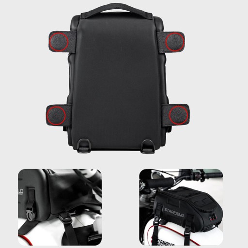 - Cztery magnesy bezpośrednio mocują torbę do zbiornika paliwa, a wiele pasków z klamrami mocniej łączy torbę z motocyklem