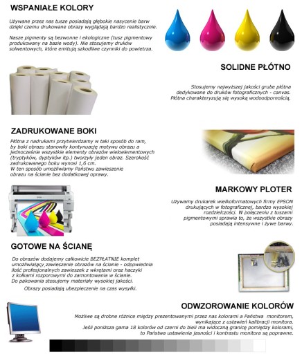 Odwzorowanie kolorów - w znacznej większości przypadków wszystkie kolory zaprezentowane na zdjęciach produktów w 100% odzwierciedlają barwy na wydrukowanych obrazach. W znikomej ilości sytuacji możliwe są drobne różnice między prezentowanymi przez nas kolorami, a Państwa monitorem, wynikające z ustawień kalibracji monitora. W celu upewnienia się, że kolorystyka fotoobrazu będzie taka sama jak na zdjęciach produktu, prosimy o zwrócenie uwagi na ustawienia monitora.