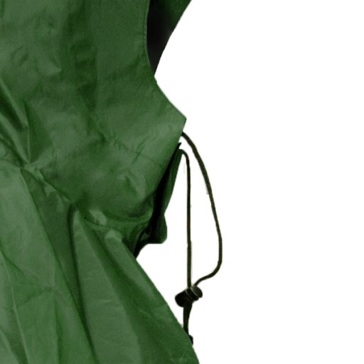 Gwarancję ochrony przed zamoknięciem oraz silnym wiatrem zapewnia wytrzymały poliester, odporny na przetarcia i mechaniczne uszkodzenia. Peleryna wyposażona jest w podklejane szwy, ściągacz w głębokim kapturze oraz zapięcie na dole, łączące przód i tył peleryny. Jej zakładanie ułatwione jest dzięki zastosowaniu specjalnego rozszerzenia na wysokości piersi. Zamykane jest ono na suwak i osłonięte dodatkową warstwą materiału, uszczelnianego za pomocą rzędu trzech rzepów.