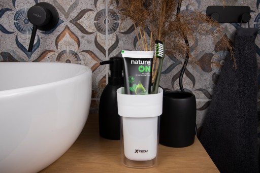 - Poza funkcją ochronną przyborów higienicznych, część nakrywki pełni także rolę kubka do płukania jamy ustnej po umyciu zębów.