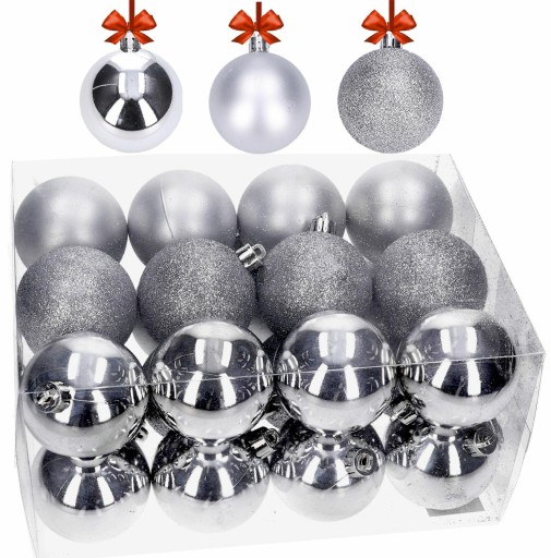 - W zestawie znajduje się kilka rodzajów bombek - gładkie matowe, brokatowe i błyszczące.
