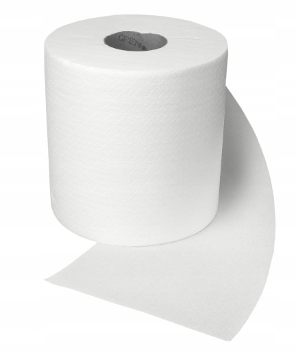 Czyściwo papierowe białe solidnie nawinięte, posiada perforację ułatwiającą odrywanie odcinków papieru z roli.