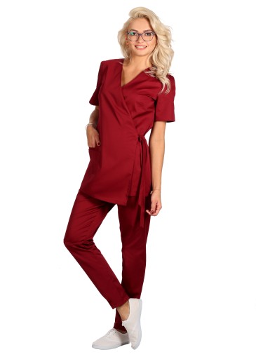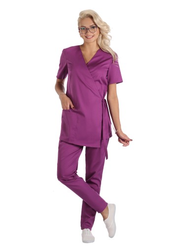 Bluza medyczna,kosmetyczna ,fason kimono. Wiązane z obu stron boki bluzy, pozwalają na dowolne dopasowanie do sylwetki ( stąd rozmiary łączone) . Lekko skośny jeden z przodów, ładnie wydłuża sylwetkę . To bluza nieco dłuższa niż klasyczne bluzy medyczne . Krótki rękaw, podwójna kieszeń na wysokości prawego biodra (mniejsza mieści smartfon) .