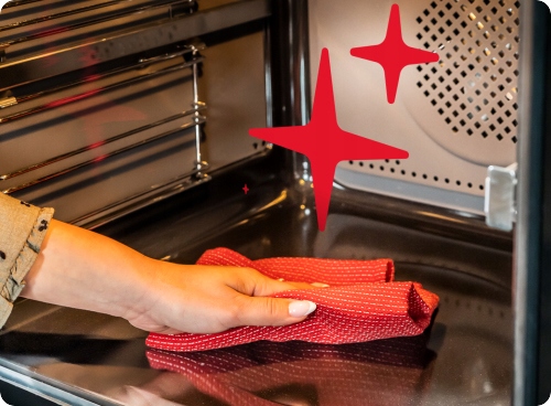 Jeszcze przed rozgrzaniem należy wlać 150 ml czystej, zimnej wody, a pozostałości po pieczeniu usunąć ściereczką.