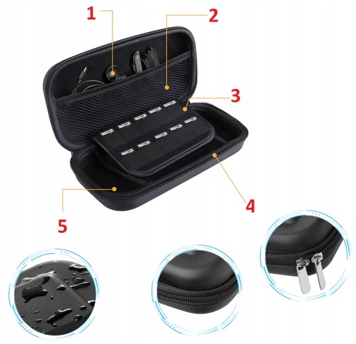 Etui z zewnątrz wykonane jest z wysokiej jakości twardego tworzywa sztucznego.Środek wyścielony jest miękkim materiałem. Switch wraz z ochroną wygląda estetycznie. Nie musisz martwić się o zadrapania, bądź uszkodzenia mechaniczne. Etui powiada wewnątrz specjalne kieszenie do gier (10 sztuk) oraz przegródkę w które możemy zmieścić inne potrzebne rzeczy np. ładowarkę, słuchawki, powerbank, pudełka z gier itd.