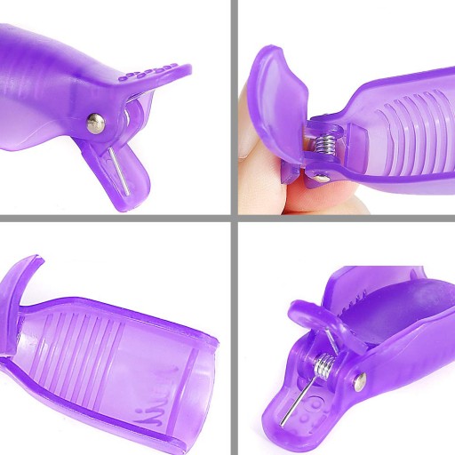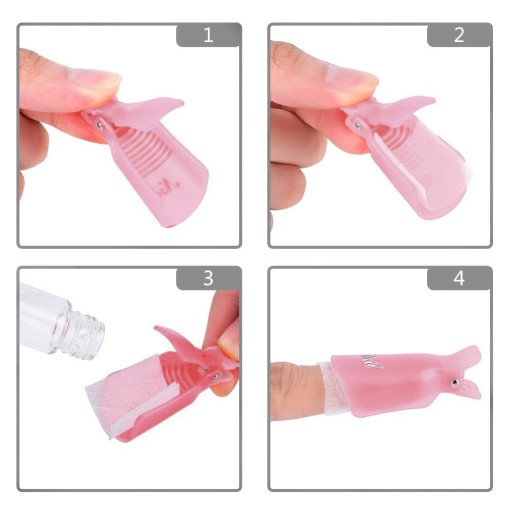 Klipsy służą do dociśnięcia wacika z acetonem do płytki paznokcia. By oczyścić paznokcie wystarczy zamoczyć wacik w rozpuszczalniku, nałożyć na paznokcie (zmatowione wcześniej pilnikiem) a następnie docisnąć całość klipsem i odczekać max 10 minut. Klipsy skutecznie i solidnie dociskają waciki jednocześnie chroniąc palce.