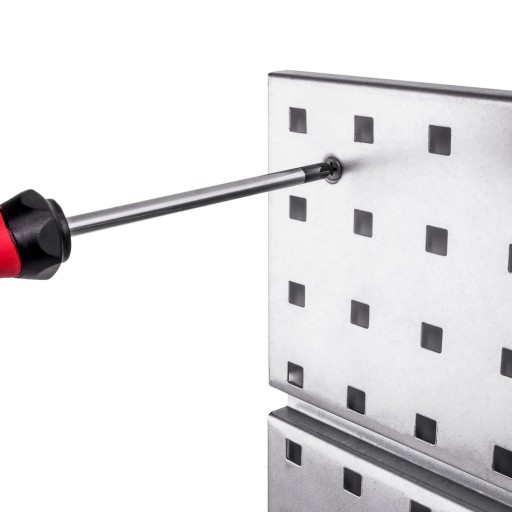 Ta solidna ściana umożliwia bezproblemowe zawieszenie uchwytów na narzędzia, oraz dzięki zastosowaniu adapterów kuwet w rozmiarze od 1 do 3 (również long i plus). Wykorzystanie czterech otworów montażowych zapewni, że obciążona płyta nie będzie odstawać od ściany.