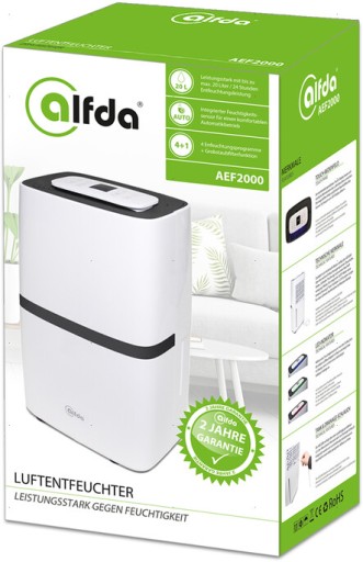 Osuszacz powietrza Alfda AEF2000 to urządzenie o eleganckim designie, przeznaczone do pomieszczeń o niewielkiej lub średniej powierzchni. Osuszacz może pracować w 5 trybach pracy i w zależności od wybranego trybu, możliwa jest regulacja prędkości wentylatora w 3 stopniach. W trybie automatycznym powietrze jest osuszane celem usunięcia wilgoci z ścian i sufitu i zapobieganiu tworzeniu się pleśni. Tryb stałego osuszania wykorzystuje niskie obroty wentylatora. Za pomocą trybu mocnego suszenia przy bardzo dużej wilgotności uzyskujemy maksymalną wydajność urządzenia. Tryb suszenia ubrań dedykowany jest do szybkiego wysuszenia wypranych rzeczy w pomieszczeniach o niewielkiej powierzchni. Dodatkowo, maszyna może pracować bez osuszania w trybie oczyszczania powietrza. O poziomie wilgotności w pomieszczeniu użytkownik zostanie poinformowany za pomocą 3-stopniowego kolorowy wskaźnika.