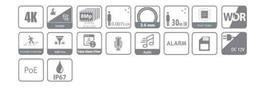 - funkcje AI: ochrona perymetryczna, SMD+ (klasyfikacja obiektu - człowiek/pojazd, filtr alarmów)