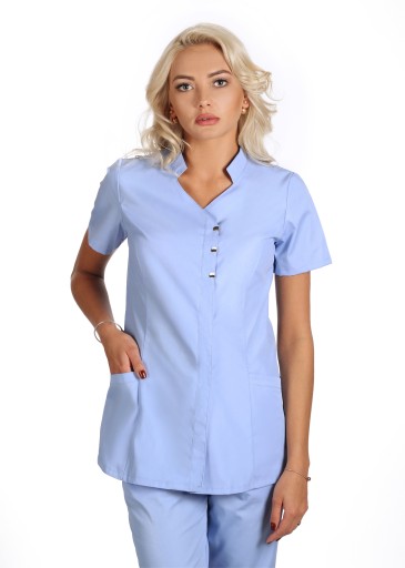 Bluza rozpinana do dołu na napy marki Schaeffer. Trzy pierwsze napy ozdobne, pozostałe kryte .W przodach modelujące sylwetkę cięcia francuskie. Mała stójka i wycięcie w serek, tworzą ciekawy dekolt. Możliwość zestawienia w komplecie ze spodniami . Krótki rękaw, dwie kieszenie na wysokości bioder (w tym miejscu proponujemy umieszczenie logo firmy, bądź personifikacji z flocka - w tym celu konieczny jest kontakt z producentem).