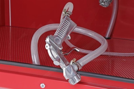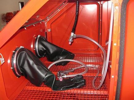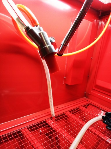 Natomiast drugi pistolet ze sterowaniem ręcznym może służyć zarówno do precyzyjnych prac jak i pneumatycznej obróbki strumieniowo ściernej większych przedmiotów umieszczonych na kracie wewnątrz piaskarki.