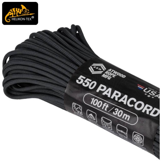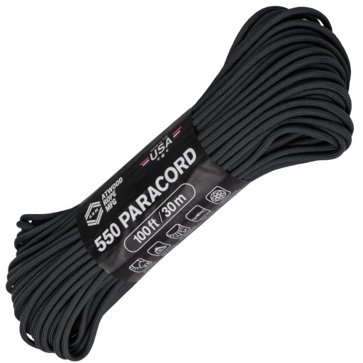 UWAGA! Przedmiotem oferty jest Atwood Linka 550 Paracord 100ft w kolorze czarnym. Pozostałe elementy służą wizualizacji funkcjonalności.