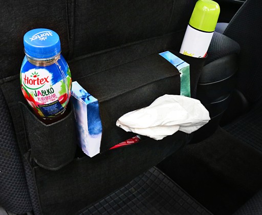 Otwory z dwóch stron pozwalają na swobodne wsunięcie do niej pudełka bądź torebki, a specjalnie wycięty w centralnej części kieszeni otwór umożliwia wyciąganie pojedynczych chusteczek bez konieczności wysuwania całości z organizera. Dwie pionowe, płaskie kieszenie, umiejscowione centralnie, to miejsce na kolejne przedmioty. Kolejne dwie skrajne kieszenie są szersze i z łatwością zmieści się w nich mniejsza puszka lub butelka z napojem, albo butelka dla dziecka.