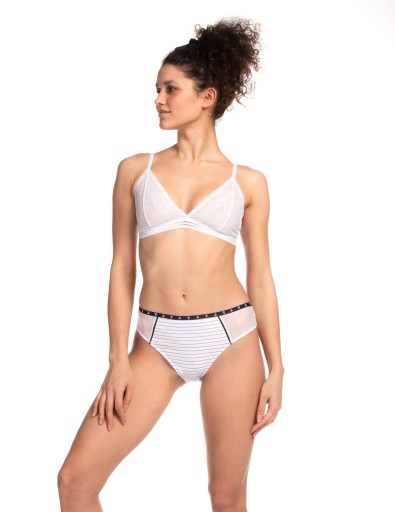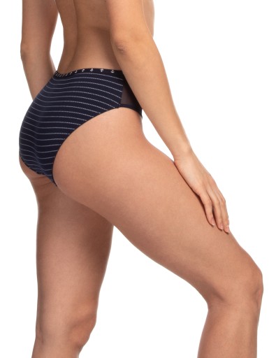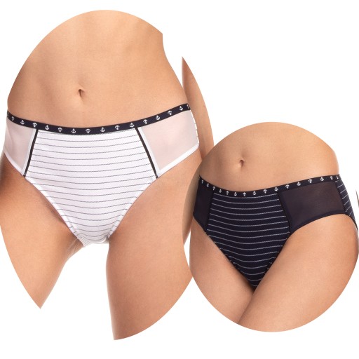 Opis produktu: Klasyczny krój fig damskich bikini z bawełny jersey. Model z modnym tiulem po bokach zwiększa komfort oraz dodaje kobiecości. W pasie dekoracyjna kokardka z zawieszką. Jedna para w kolorze białym druga w kolorze czarnym. Obie pary z motywem morskim.