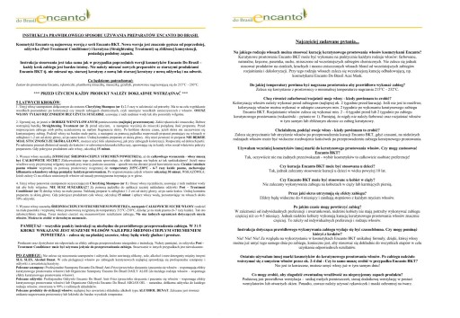 INFORMUJEMY IŻ NIE BIERZEMY ODPOWIEDZIALNOŚCI ZA ŹLE PRZEPROWADZONY ZABIEG, PRODUKT ENCANTO POWINIEN BYĆ STOSOWANY ŚCIŚLE Z ZAŁĄCZONĄ DO NIEGO PAPIEROWĄ INSTRUKCJĄ, KAŻDY ŹLE LUB NIEDBALE WYKONANY KROK POWODUJE SŁABSZY EFEK PROSTOWANIA LUB ZNISZCZENIE WŁOSÓW!