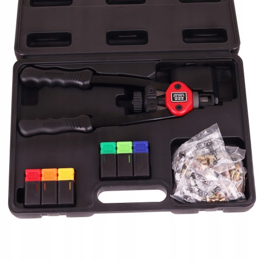 Ręczna nitownica do nitonakrętek wraz z walizką, nitonakrętkami, głowicami do różnych rozmiarów nitonakrętek, kluczem.