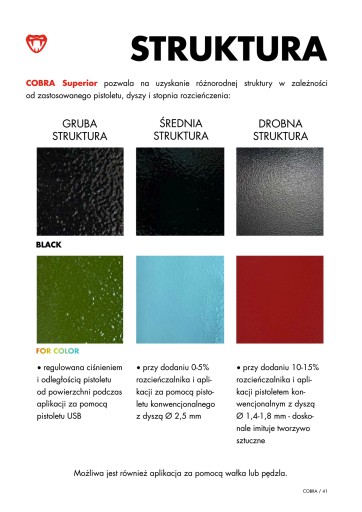 COBRA Superior pozwala na uzyskanie różnych efektów strukturalnych w zależności od stopnia rozcieńczenia i średnicy dyszy użytej do aplikacji.