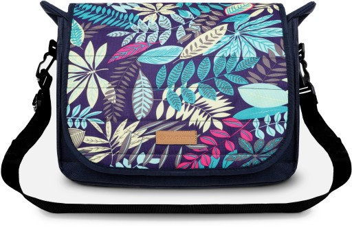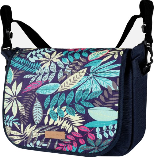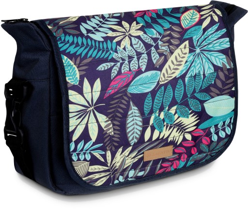 Torba bez wątpienia zwraca uwagę kolorami. Na granatowym tle mnożą się piękne liście w odcieniach zieleni, żółci, różu i brązu. Takie połączenie od razu wprawia w lepszy nastrój. Print świetnie komponuje się z różnymi stylami, więc torba pozostaje uniwersalna. Print jest umieszczony tylko na klapie torby. Reszta ma kolor granatowy.