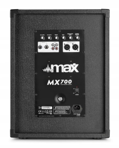 Zestaw głośników MX700 jest wyposażony we wzmacniacz o mocy 700W. Ta moc jest podzielona między subwoofer (400W) i obie góry (150W na górę). Subwoofer wyposażony jest w 12" głośnik niskotonowy, który zapewnia wspaniały głęboki i dudniący bas. Oprócz wejścia liniowego, wzmacniacz w subwooferze posiada również wejście mikrofonowe, dzięki czemu zestaw można wykorzystać również do prezentacji lub przemówienia. Wbudowany efekt echa, który można dodać do sygnału mikrofonu.