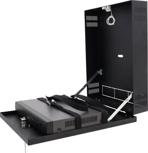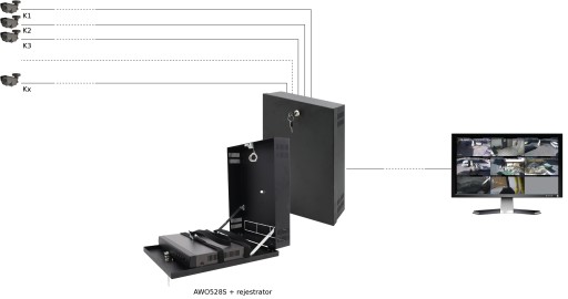 W obudowie AWO528 rejestrator jest mocowany do drzwiczek przy pomocy pasków. Drzwiczki poruszają się w pionie i gdy są one zamknięte, rejestrator znajduje się w pozycji pionowej i zajmuje niewiele miejsca. Po otwarciu drzwiczek, rejestrator znajduje się w pozycji poziomej, która znacznie ułatwia do niego dostęp. W takiej konfiguracji podłączenie dodatkowych kamer lub zmiana parametrów pracy rejestratora nie powinny sprawiać większych problemów.