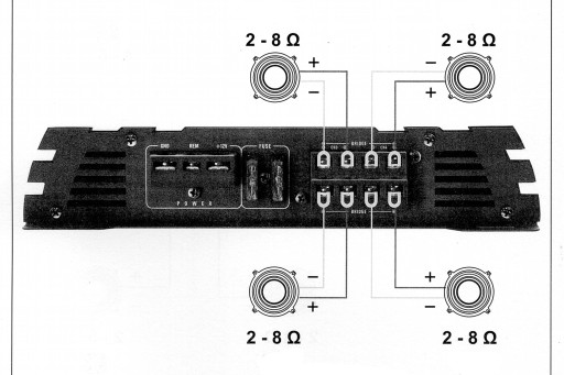 Zastosowanie do zasilenia jednej pary głośników i subwoofera. Oddzielne zwrotnice dla kanałów 1-2 i 3-4 dają możliwość doskonałego ustawienia parametrów dźwięku dla pary głośników i subwoofera zasilanego w mostku. Jeden wzmacniacz zasila cały system audio.
