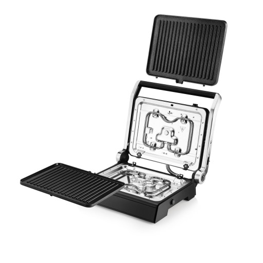 ▶ Zaletą tego urządzenia jest możliwość otwarcia płyt pod kątem 180°, co zapewnia wygodę przy smażeniu i pieczeniu warzyw, mięsa, ryb i innych potraw na obydwu płytach jednocześnie.